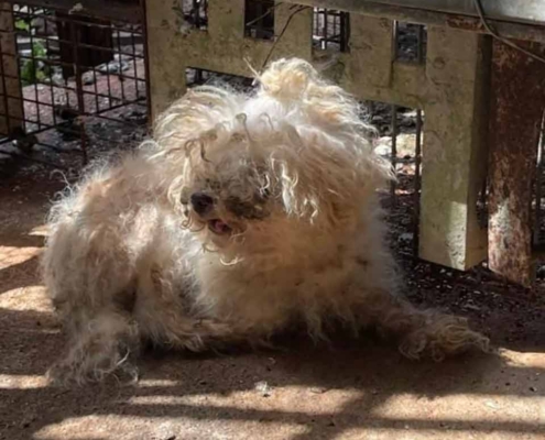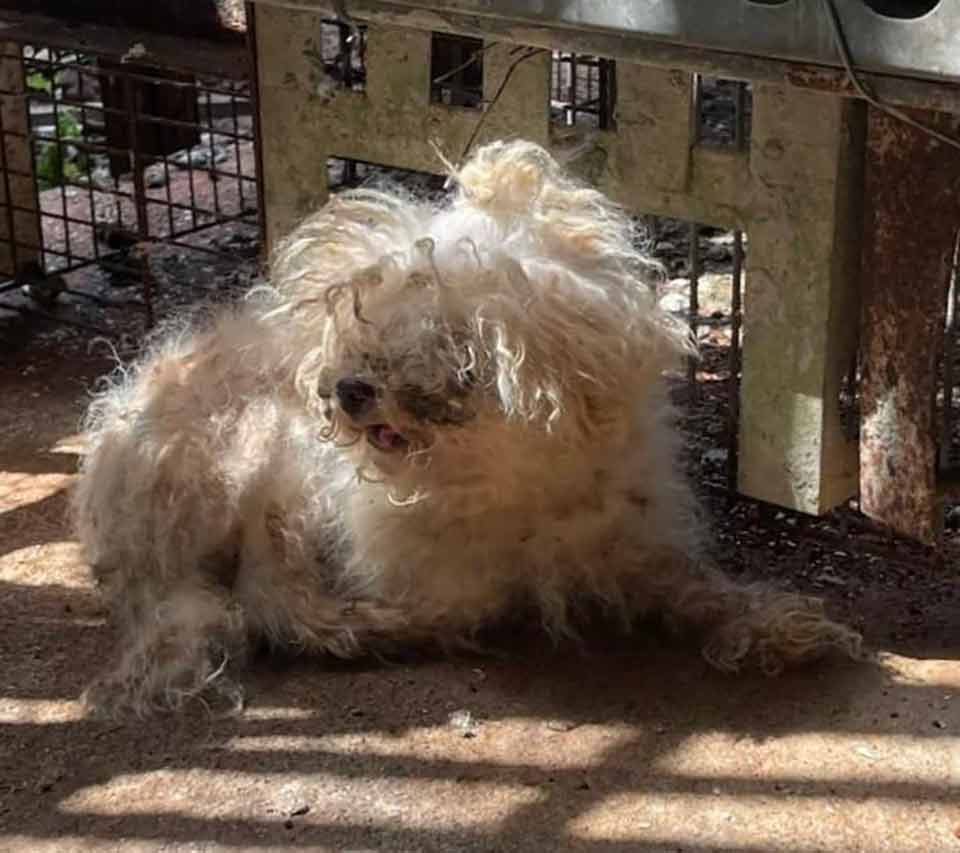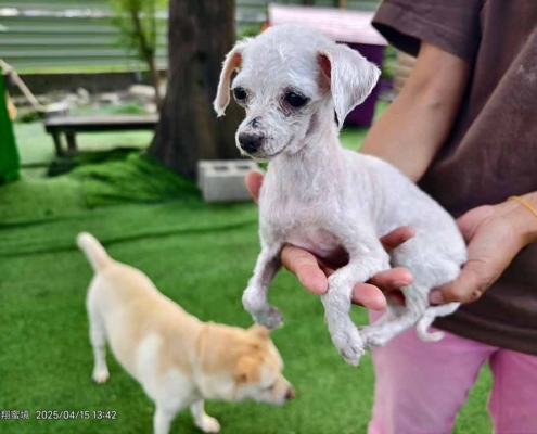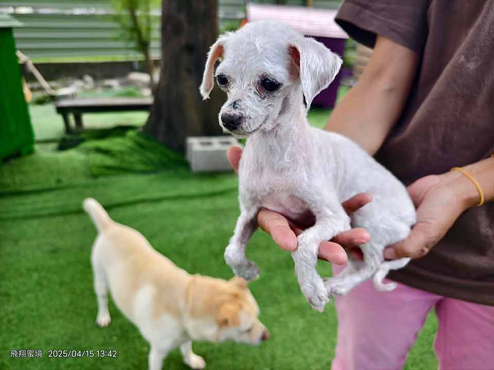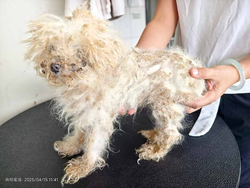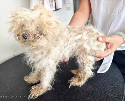 於是我們接援回來 幫牠除蚤 洗淨沾黏糞便的毛髮 修剪掉全身的毛結團 還牠一身清爽 乾淨全新的膚質與模樣