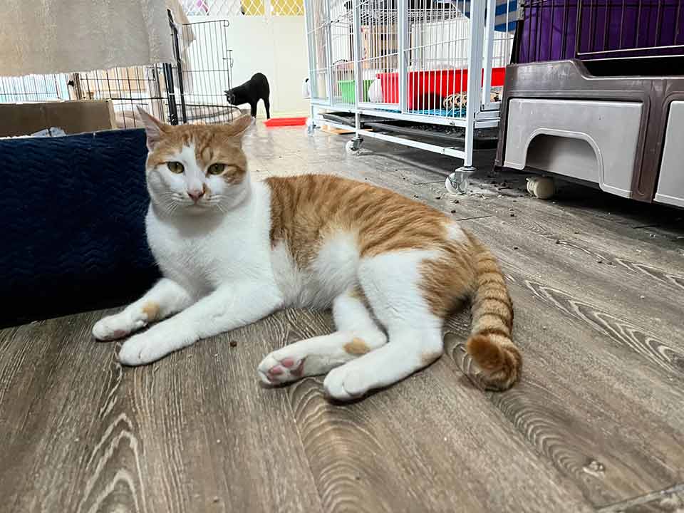 故事:被車子撞到後因傷到腦部視眼膜神經失去了視力,但醫生告知有恢復視力的可能因此館內職工細心指引讓牠知道貓砂及食物在何處,漸漸的我們發現牠的視力恢復了!因為當職工在桌子上準備食物時牠能精準地跳到桌上偷吃且呼喊牠的名字時也會雀躍地跑過來討摸摸,是一隻貪吃又愛撒嬌的活潑貓咪
