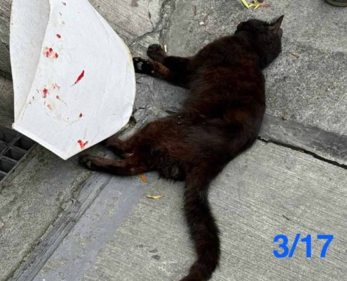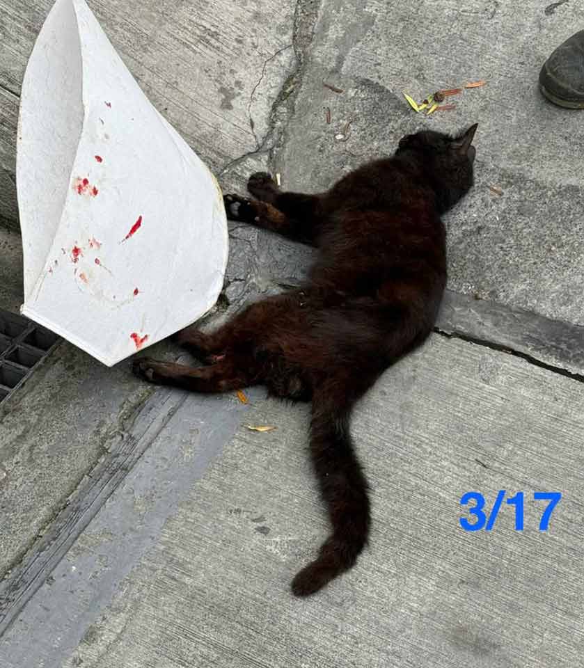 發現草叢裡躺著一隻不斷抽蓄的黑貓 他馬上抱起黑貓 往醫院衝